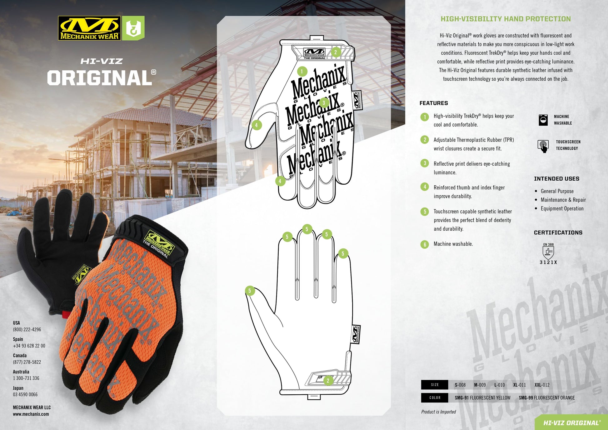Hi-Viz Original® arbeidshansker er designet for å gi maksimal synlighet og beskyttelse under arbeid i lavt lys eller mørke forhold. Med fluorescerende TrekDry® for pusteevne og reflekterende trykk som gir en iøynefallende lysstyrke, holder disse hanskene hendene dine både kjølige og synlige. Syntetisk lær med berøringsskjerm-teknologi lar deg alltid være tilkoblet, uansett hva du jobber med.